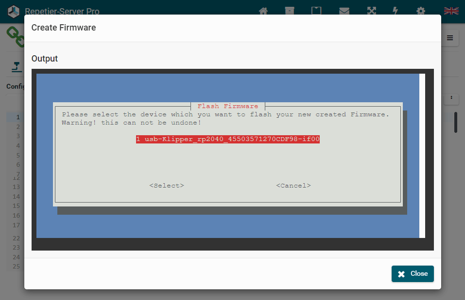 Repetier-Server Pro supports the guided installation of the firmware Klipper on your devices. To install Klipper, select the Klipper firmware during printer creation. The button Install appears. When you click this button, a menu appears that installs all dependencies and installs Klipper properly. Note that the default path of the installation is not /home/pi/klipper as in a normal installation but /opt/klipper/SLUG and this directory belongs to the user "repetierserver" and is therefore not accessible with the user pi.